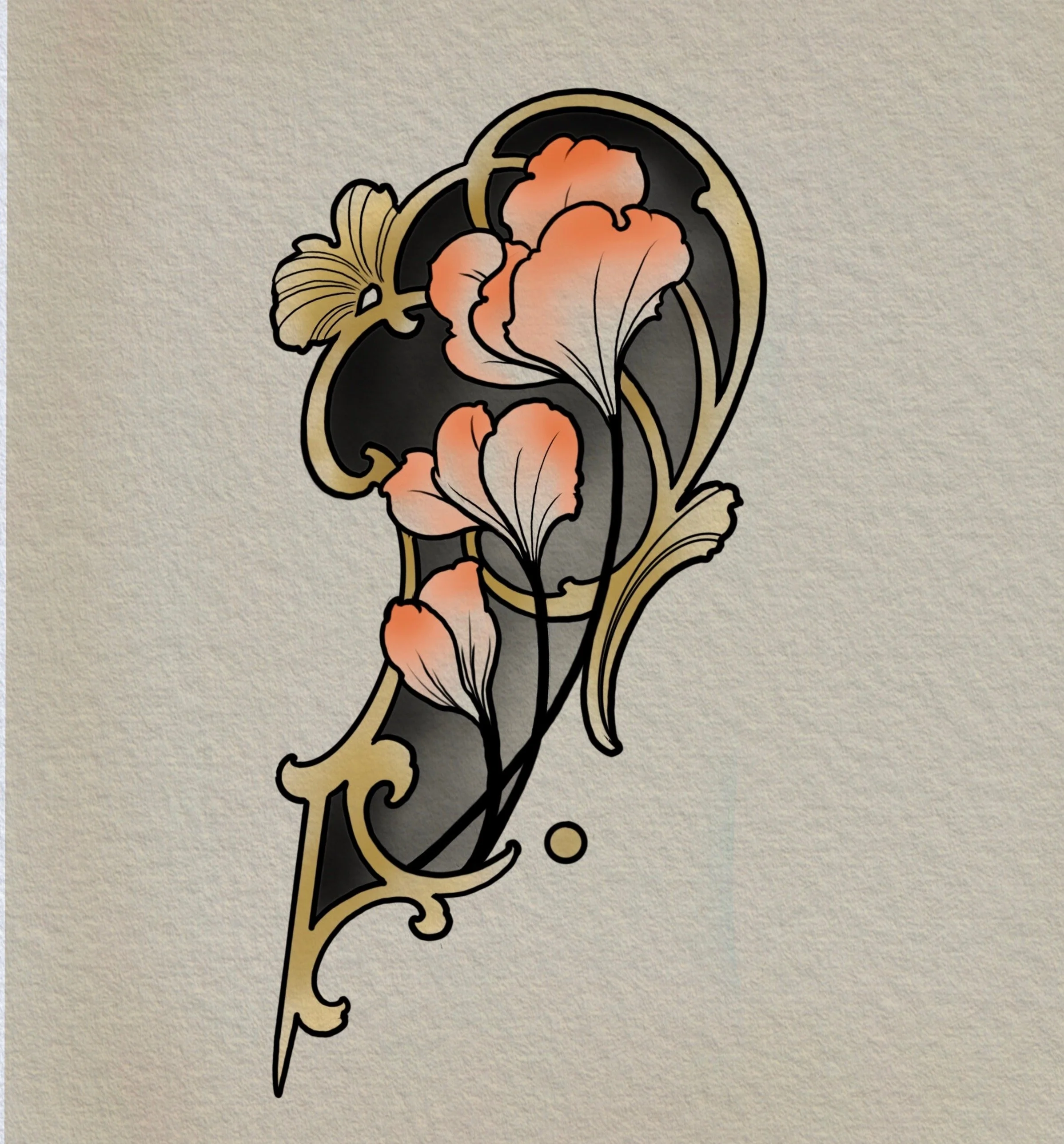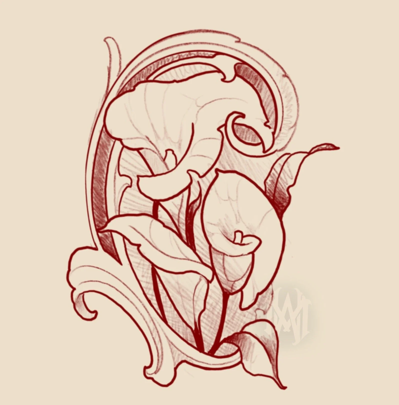 Gilded Lillies. Art Nouveau posey of Calla Lillies with decorative frame. Can be done in colour or black + grey.