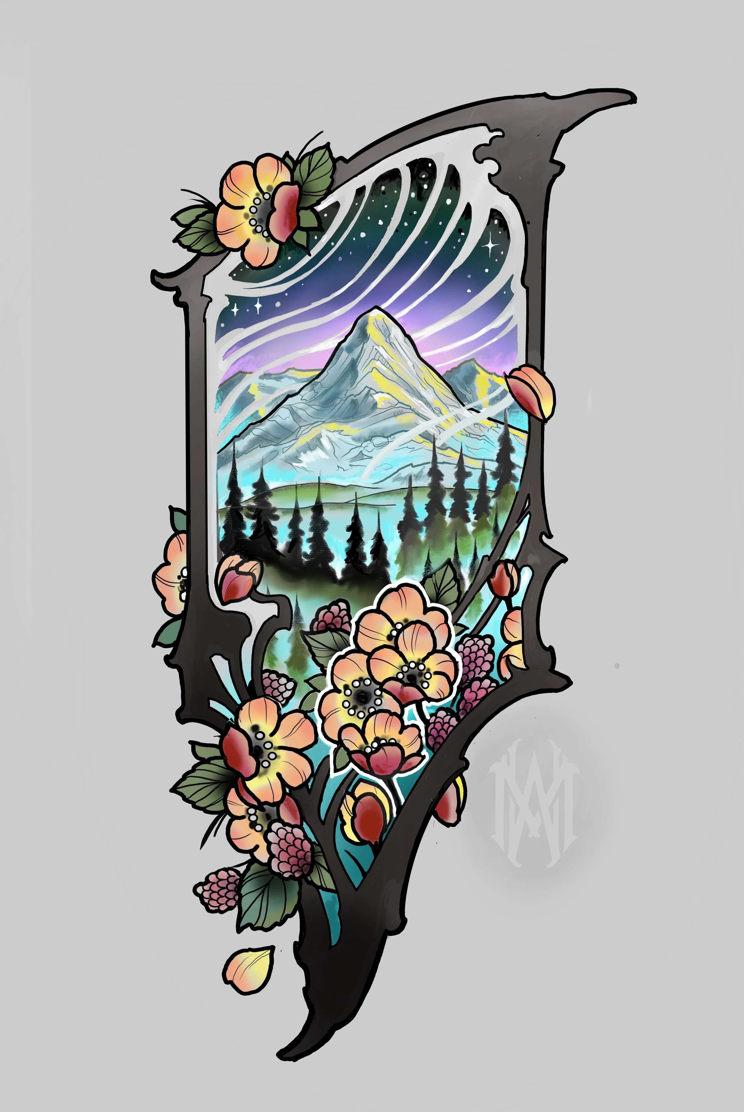 Northwest Passage. Pacific Northwest mountain landscape, with filigree and floral trim. Suitable as a larger project.
