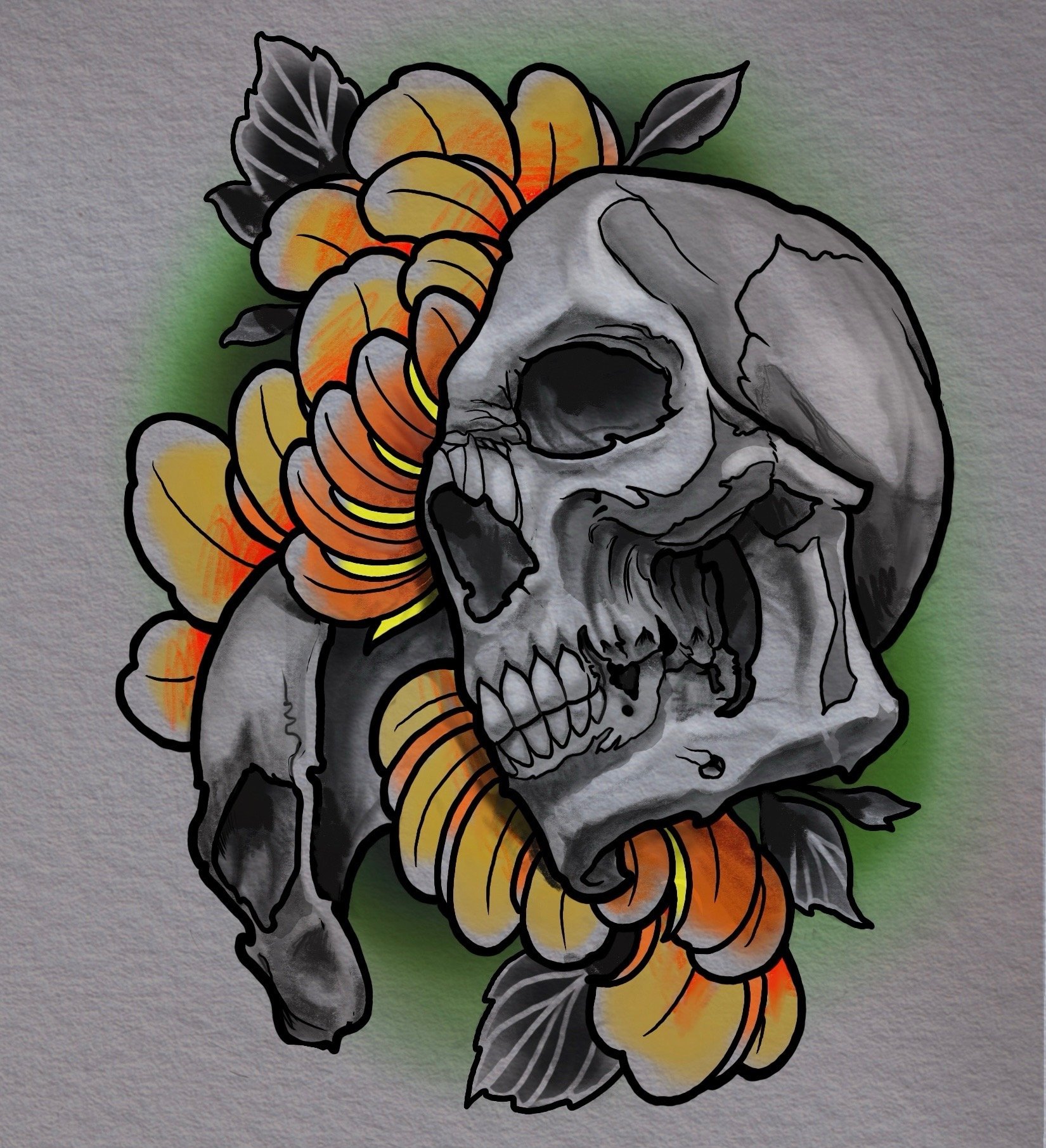 “Alas, poor Yorick!” Illustrative skull and floral design with striking detail. A study of death and renewal.