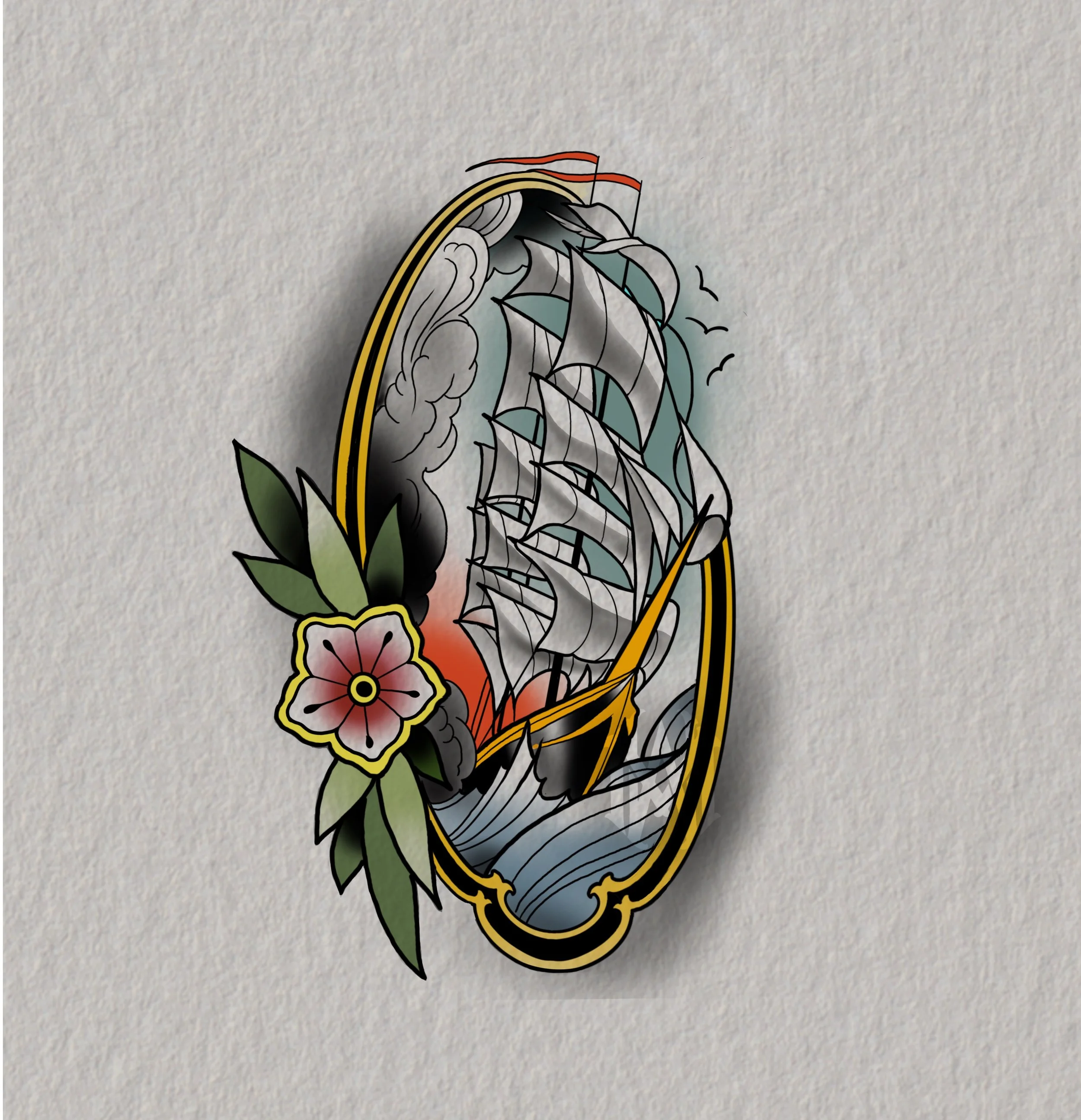 Hold fast! Neo trad style tall ship, navigating troubled waters with decorative frame and floral trim.